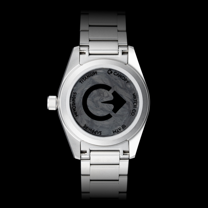 An ode to Canopy's debut model, Field One exhibits a futuristic caseback that features floating text and logo over a solid disc of forged carbon fiber.