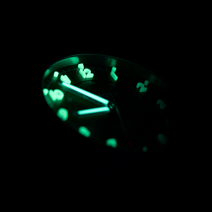 Utilizing SuperLuminova's cutting-edge LumiCast technology, each numeral is solid infused C3 X2 lume. Field One's dial legibility shines in the darkest of environments.