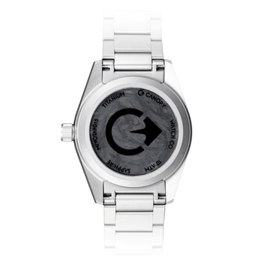 An ode to Canopy's debut model, Field One exhibits a futuristic caseback that features floating text and logo over a solid disc of forged carbon fiber.